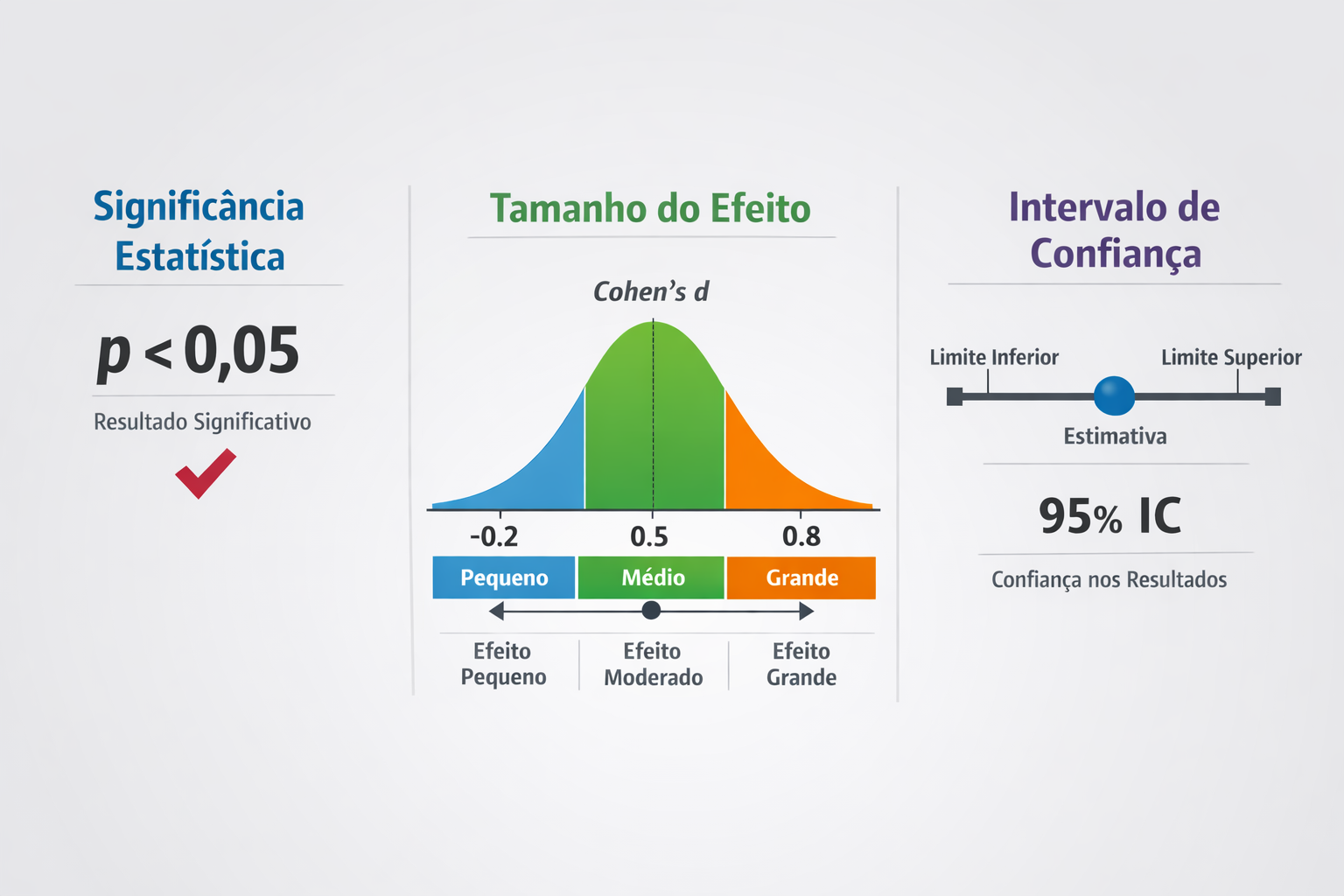 O p-valor, o tamanho do efeito (effect size) e os intervalos de confiança são três componentes centrais da inferência estatística. Apesar de frequentemente utilizados em conjunto, representam conceitos distintos e complementares. A sua correta interpretação é fundamental na investigação científica e na elaboração de teses, dissertações e artigos académicos.